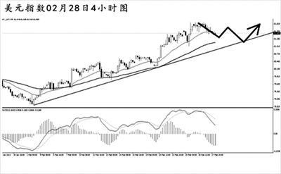 目前美元指數突破81.40的高點阻力,上方空間被進一步打開。4小時圖均線系統多頭排列,上漲斜率陡峭。由于價格與趨勢線距離較遠,美元指數面臨一定的下調風險。小時圖MACD頂背離信號發揮了效果,美元指數小幅回落。下方重要的支撐在道氏低點81.00一線,只要美元指數不跌破此位置,后市仍有繼續上沖的動力。