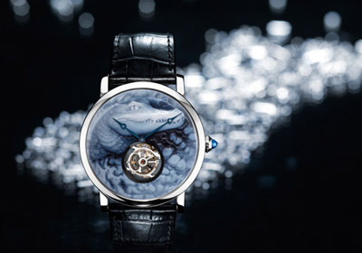 Cartier(卡地亞)傾注無比熱情,大膽地將微妙的浮雕技術運用于制表藝術打造這款腕表。天然瑪瑙微妙的漸變藍色不禁令人想起大海,一條惟妙惟肖的鱷魚在寶石切割師的鬼斧神工下從海浪中浮現出來。