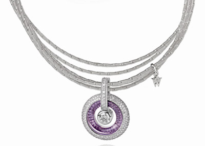 紫色迷情 紫寶石的深邃極具吸引力,神秘而誘人。融合魔法護身符吊墜最引人注目之處在于華洛芙以獨特的技藝將紫水晶鑲嵌在鋪滿鉆石的底層,令紫色水晶散發出無比耀眼的璀璨光芒。在紫色水晶的下面,閃耀著如火焰般明亮耀眼的鉆石,鉆石特殊的鑲嵌方式產生了完全奇特的折射和亮澤。