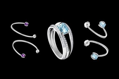 新品以海藍寶、摩根石、桔榴石、紫水晶、橄欖石五種彩色寶石為主要原料。其中新款戒指為全新設計,中心彩寶由兩圈鉆石弧形環繞,獨具新意。 此外,圈式耳環也出了新尺寸,滿足個性之需。