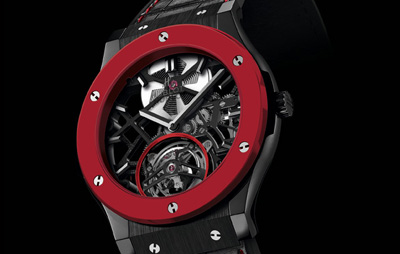 Watch摩納哥紅致敬——HUBLOT宇舶表全球首創明亮的彩色陶瓷材質,呈獻與黑色或白色陶瓷一樣高質的亮紅色陶瓷腕表“紅與黑鏤空陀飛輪”,也是一項申請國際專利的腕表。