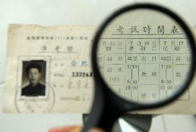 2013年高考在即,一張有56年歷史的“全國高等學校1957年統一招生準考證”現身安徽合肥。該準考證是合肥一收藏愛好者從收藏市場獲得的,從準考證上可以看到,當年的考試時間是7月15日至18日。新華社發