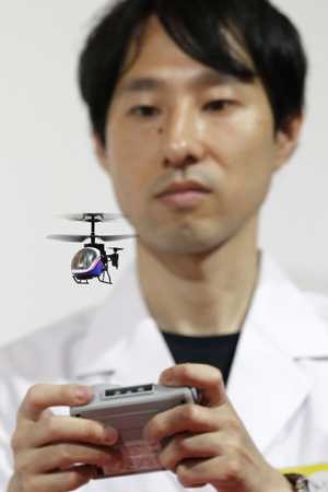 在2013東京國際玩具展上,工作人員展示中國銀輝玩具公司推出的遙控飛機“納米獵鷹”!凹{米獵鷹”長8.11厘米,高5.09厘米,寬2.24厘米,是載入吉尼斯世界紀錄的最小遠程遙控模型飛機。