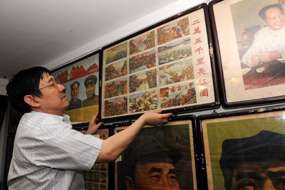 6月30日,程宸將他最近收藏的紅軍二萬五千里長征圖連環畫掛到墻上并向來賓交流了當時印刷長征圖連環畫的歷史背景。 現任中國名家書畫研究院副院長的程宸,是我國著名的紅色收藏大家,他從上學集郵到現在的紅色收藏已有39個年頭了。多年來,他收藏紅色藏品和有關毛澤東的像章、書刊、宣傳畫、瓷像、郵品、繡品、油畫等達20多萬件。