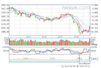 判斷大盤震蕩上行的依據并不是在于政策面出現了一些趨好的跡象,主要是基于大盤的技術走勢。例如在6月25號,大盤在跌破解放底之后,突然加速下跌,下探1849點,如此瘋狂的空頭觸動了監管層的政策紅線,立即有大資金把大盤硬硬地托回到1949點之上的1959點,這十分明顯地向市場表明1949點就是政策底,所以大盤在該點位震蕩可以,打滾可以,橫行可以,但不能再次下行,這就是判斷近期大盤的主要參照點。