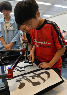 書法機器人是慶應大學教授桂誠一郎的智慧結晶。說是機器人,其實主體是一段機械臂,外加多個發動機。書寫時,機械臂緊握毛筆,“腕”平管直,一如常年練習者,發動機發出輕微的嗡嗡聲。