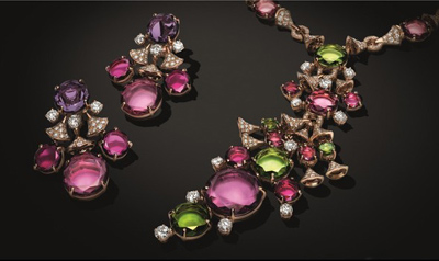 本系列首飾采用紫水晶、橄欖石與紅碧璽等珠寶,綻放喜悅的活力,將中央的小型鉆石襯托得更加璀璨奪目。這些造型精巧的珍貴珠寶以現代風格重新詮釋