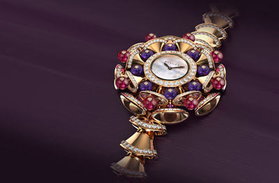 本系列運用虛實相間的形態對比,以細致的立體杯狀花詮釋扇子的情致意態。盛開的優美花瓣點綴造型華麗的腕表,穿插鋪鑲閃亮的鉆石。白金款式則全面鋪鑲鉆石,精致的扇子于是形成優雅的花串,隱約流露幾分東方韻味,賦予高雅的閃亮效果。此外,本系列其他款式在設計上也有令人驚喜的變化:色彩歡快的圓珠形紫水晶、橄欖石或紅碧璽,烘托著鑲嵌于其間的小鉆石。自1950年代末以來,BVLGARI便以運用凸圓形切割享有盛名。而在這次的設計上,彩色寶石形態充滿靈奇之趣,為珠寶作品賦予獨特的豐盈感與現代風味。每一顆寶石都在中央琢出一個凹槽,以便鑲入鉆石。此一工序看似簡單,實則須有高超技巧才能保持寶石完美無缺。小扇子排列成形,有大有小,或上下顛倒,或似傾瀉而下的彩色瀑布,變化無窮的幾何構造宛如一串串催眠音符,令人目不暇給。