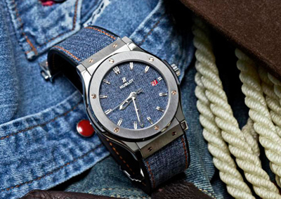 Hublot(宇舶)此次推出的經典牛仔腕表將牛仔與鈦完美結合。牛仔織物表盤上有一個顏色對比鮮明的紅色日期顯示。該腕表有兩種尺寸可供選擇:42毫米和45毫米。每一種尺寸都搭配HUB