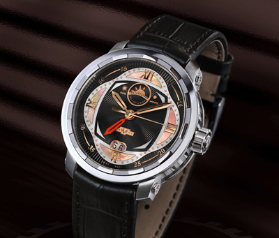 詩意表盤的復雜結構為品牌自創,采用花型圖案來加強不同裝飾的效果:整體射線圖案;四個時區的半月形圖案,采用了罕見的米色珍珠母,而分鐘顯示則采用了赤金;小時顯示為羅馬數字,表盤四周分鐘為阿拉伯數字。紅色鏤空劍形指針,讓第二時間區域極易辨認,而處于12點位置的「日相」,則運用日升和日落來延續了品牌系列的詩意。