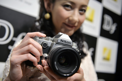 11月5日,在日本東京舉行的一場媒體活動中,模特與尼康公司新款全畫幅數碼單反相機“尼康Df”合影。這款機型延續了經典的手動對焦單反相機外觀,幾乎可以搭配所有尼康F卡口鏡頭。
