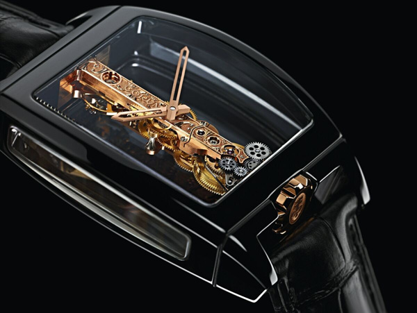 長形機芯置于黑色陶瓷表殼內,表面、表背及兩側由藍寶石水晶玻璃制成,360度透視出直線式 機芯結構,讓人陶醉于迷人的透明藝術之中。設于上層的夾板橋由5N18K