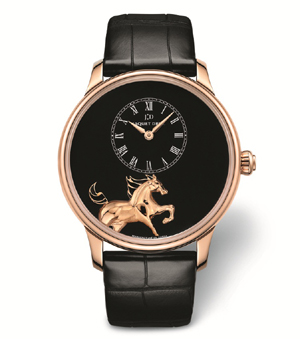 2014年,中國迎來馬年,馬不僅是活力與勇氣的象征,更是今年雅克德羅(Jaquet Droz)生肖腕表的主角。該品牌推出的三款專屬腕表皆由雅克德羅的手工藝大師采用獨一無二的精湛工藝打造而成。鐫刻、微繪……每一匹駿馬的肌理、馬鬃都刻畫得非常細致,惟妙惟肖。表盤上的駿馬矯健俊逸,姿態瀟灑,仿佛脫離了韁繩的束縛,在遼闊的原野上掣風而馳。