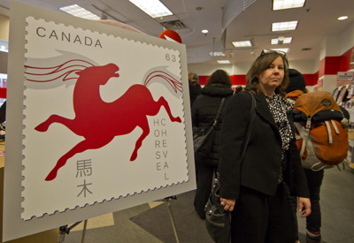 1月13日,在加拿大多倫多一家郵局,一位女士從一幅加拿大國內版馬年生肖郵票海報旁經過。 當日,為迎接中國農歷甲午馬年,加拿大郵政總局開始發行馬年生肖郵票,包括首日封、紀念封、國內及國際版郵資郵票等。加拿大郵政總局于1997年開始發行中國生肖郵票。