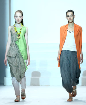 日前,京東攜手數十家服裝品牌在北京舉行主題為“尚·京東”的2014春夏時尚新品發布會,旨在打造“時尚生活在京東”的全新理念。圖為模特在展示最新春夏服裝。