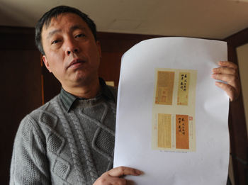 收藏家劉益謙手持蘇軾《功甫帖》的照片復印件介紹相關情況。記者
