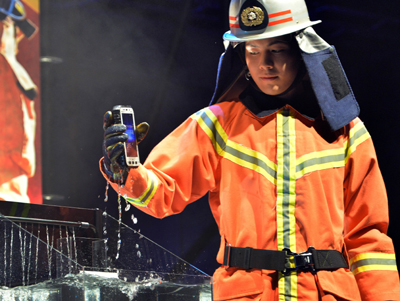 在日本東京,一名身著消防員裝束的模特將松下“Toughpad FZ-X1”型平板電腦置入水中,以測試它的防水功能。這種新款平板電腦搭載有5英寸LCD觸摸屏和長壽命電池,具備防水、防塵、防震的“三防”功能,將于今年6月在日本發售。