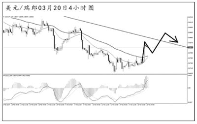 美元兌瑞郎短線發起強勁反彈。4小時圖MACD多頭動能充盈,目前需重點關注下降趨勢線的阻力位0.8850一線,若能升破此位置,匯價還將展開更為強勁的上攻。