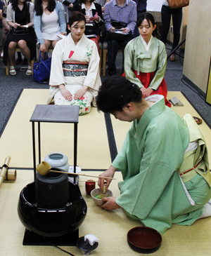 筆者參觀了2013年在此舉辦的第5屆世界茶節評比出的獲獎茶葉和展出的各國傳統茶具和創新茶具。當地茶莊雅正庵還表演了“切茶壺口”儀式!扒胁鑹乜凇笔敲磕11月茶莊開始飲用當年的新茶時舉行的儀式。當年4月下旬開始采摘的新茶用紙包成兩根手指粗的小捆,裝入上小下大的壇形壺中封好,到楓葉始紅時點茶師用刀切開壺口,取出來品嘗。雅正庵的女茶師用木托盤捧著剛“出壺”的新茶和寫在宣紙上記載著茶品種和采摘日期的“茶入日記”到筆者面前,雖隔著紙,但茶香撲面而來,沁人心脾。