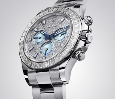 蠔式恒動宇宙計型迪通拿鑲鉆腕表,將氣派顯貴的950鉑金與品質純凈的閃爍鉆石巧妙融合。除了冰藍色計時盤,整個表面密鑲鉆石。這表面顏色僅勞力士鉑金腕表所獨有。華麗奪目的外圈鑲有36顆方形切割鉆石。