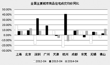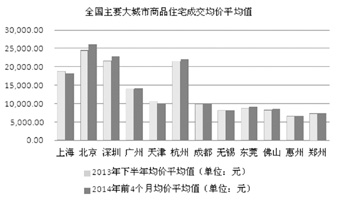 截至2014年5月14日的統計數據,我們從13大城市商品房存量套數排名可以看出:庫存最多的主要集中在浙江和青島,幾乎從去年同期以來就一直處于全國最前列,即使不再有新的商品房推出,去庫存也需要很長一段時間,這也驗證了最近樓盤降價新聞報道最多的主要集中在寧波和杭州的事實。其他城市去化壓力不是非常大,庫存環比都微幅增加或者減少,同比除了蘇州和福州增幅較大,其他城市增幅在10%上下。因此各主要大城市房價下降的并不明顯。這與下圖2014年前4個月全國主要城市住宅成交價均值也吻合。