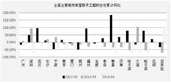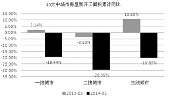 我們從上述數據可以看出:房地產市場成交量大幅回落,而房地產開發商的激情與成交量息息相關。2013年全國40個大中城市一線,二線城市同比出現小幅下降,三線城市略微上漲,這也和國內具體主要城市的房屋新開工面積在2013年漲跌相吻合。當時間進入到2014年后除了河北石家莊因前期的京津冀一體化政策的影響,新開工面積出現大幅上漲外,其他40個大中城市和國內具體主要大城市新開工面積同比全部出現大幅下降,尤其是二線城市降幅更大,因此二線城市地產市場壓力可能會更大一些。