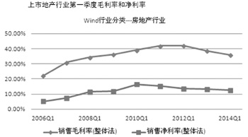我們從近9年房地產行業年毛利率和凈利率以及第一季毛利率和凈利率圖可看出:從2012年第一季開始就出現大幅下降。隨著市場蕭條,行業融資資金更加困難,資金成本會進一步上升,預計2014年上市房地產公司的毛利率和凈利率依然難有明顯回升,這將導致行業利潤率面臨進一步下行壓力。