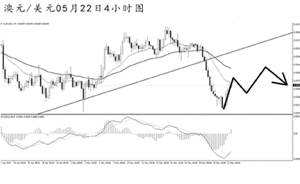 澳元兌美元將大級別上升趨勢線的支撐跌破后繼續走弱。日線圖上看,匯價已經跌破了均線系統的依托位,漲勢遭遇到一定的挑戰。4小時圖連續收出實體陰線,雖然短線多頭力度重新展現,但主下跌趨勢尚沒有發生改變。預計澳元后市仍有走弱風險,關注0.9200的支撐,匯價強力跌破此位置后可考慮繼續入場做空。