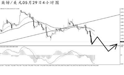 歐元兌美元跌破道氏低點支撐1.3670之后保持下跌節奏。日線圖均線系統空頭排列,下方的下一道強支撐在1.3475,歐元仍有較為廣闊的下跌空間。4小時圖MACD發生了角度明顯的底背離信號,但下降趨勢線的壓制作用仍然完好。預計短線歐元發生一定力度反彈的概率較大,但此后仍將以下跌走勢為主。