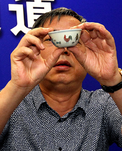 7月19日,收藏家劉益謙正在展示明代“斗彩雞缸杯”。當日,劉益謙攜2.8億港元拍得的明成化“斗彩雞缸杯”從香港返回上海,并隨即將之入庫上海西岸藝術品保稅倉庫,此舉標志著最重要中國瓷器之一回歸中國,并成為上海龍美術館的鎮館之寶。據悉,明成化“斗彩雞缸杯”4月8日在香港蘇富比工藝品拍賣會上,以2.8124億港幣成交,刷新中國瓷器世界拍賣紀錄。記者