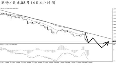 英鎊兌美元上探趨勢線阻力,隨后強力暴跌。從4小時圖看,匯價下跌斜率加大,再度遠離了趨勢線的阻力,預計短線面臨一定的上調壓力,但整體走弱的趨勢不易發生改變。