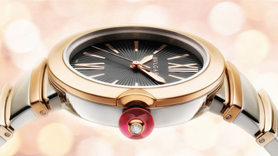 以高級珠寶而享富盛譽的寶格麗在每一件LVCEA作品的表冠上都嵌入了一顆剔透的寶石。其中高貴的紫色寶石尤為獨特,展現寶格麗設計大膽而鮮明的經典魅力。此外,表冠上還鑲嵌有一顆璀璨的鉆石,象征著女性由內到外的迷人魅力。