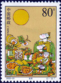 2002年9月21日,為慶賀“天上人間共團圓”的中秋節,中國郵政發行了主題為《中秋節》特種郵票一套3枚。