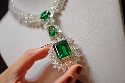 10月1日,在新加坡,一名模特在展示綠寶石套件。當日,新加坡珠寶節舉行預展。珠寶節將于10月17日至26日舉行。