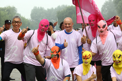 GE 2014“關愛先行 粉紅行動”關愛女性乳腺健康大型公益活動日前在北京奧林匹克森林公園開啟。此次活動旨在提倡“早預防、早發現、早治療”的早健康理念,宣傳乳腺癌防治知識,并呼吁全社會加強對女性乳腺健康的關注。圖為健康愛好者頭戴臉基尼一起合影。