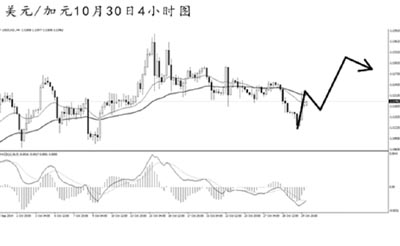 美元兌加元探底后強力回升。從4小時圖上看,目前多頭力度有所暴發,但主趨勢仍然向下。最近一條上升趨勢線的支撐已被跌破,短線匯價有繼續下行的動力。在有效升破1.1255的道氏點之前,看漲仍需謹慎。