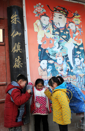 幾名兒童在朱仙鎮一家年畫作坊外玩耍。 |