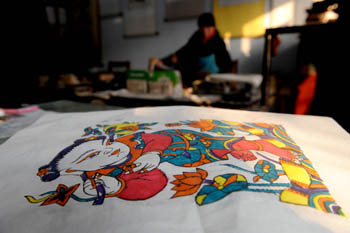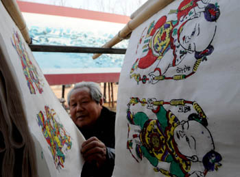 國家非物質文化遺產——河南省開封市朱仙鎮木版年畫是中國木版年畫的鼻祖,是中國古老民間藝術精華,它源于唐,興于宋,鼎盛于明清。明末清初,朱仙鎮生產木版年畫的作坊達300余家,年銷量幾千萬張。春節臨近,河南省開封市朱仙鎮幾十家木版年畫作坊也正抓緊時間制作年畫,供應節日市場。