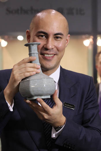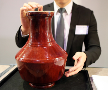 這是香港蘇富比工作人員在春拍預展上向賣家展示清雍正窯變釉弦紋盤口瓶。記者 李鵬