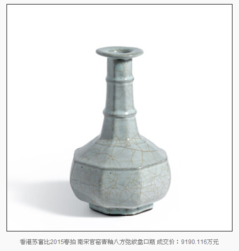 2015年已經過半,藝術市場上各大拍行春拍也相繼收槌。瓷器板塊,香港蘇富比春拍一件南宋官窯青釉八方弦紋盤口瓶以1億1388萬港元(約合9190萬人民幣)的成交價占據2015上半年的排行榜頭名,這一價格也成為宋代瓷器歷史第三高拍賣成交價。高古瓷器的市場走高也被相當一部分業內人士認為是古瓷市場回歸理性的征兆。