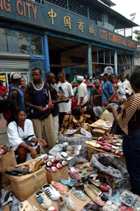 在喀麥隆經濟首都杜阿拉的中國商城,當地小販在售賣中國商品。本報記者 楊磊