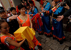 “萬壽龍團貢茶”到達返鄉之旅的第一站北京宣武區馬連道茶葉一條街面向市民展出。本報記者 李石磊