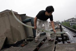 6月2日,工作人員在無錫市曹張新村的一幢居民樓頂清空水箱中的存水。在經過專家17個小時的反復實驗后,6月1日上午7時40分,檢測數據顯示,無錫市自來水總公司制水廠出水的臭味被成功消除。供水部門加大主水道的供水量,呼吁市民打開水龍頭放掉管道陳水。截至3日下午,無錫市出廠自來水的水質基本合格,藍藻污染導致的臭味基本清除。市民除飲用和做飯仍依賴純凈水外,其他生活用水已經正常。新華社發(宦瑋攝) | 太湖藍藻大規模暴發造成無錫市民生活用水困難,再次敲響了太湖生態環境惡化的警鐘。中國科學院南京地理與湖泊研究所對太湖生態環境狀況長期研究的結果顯示:工業污染增加、農業面源污染擴大、城市生活污水直接入湖和漁業養殖規模急速擴張是造成太湖水環境惡化的主要原因。