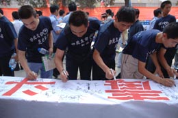 6月26日,山東省和濟南市禁毒委員會在濟南市濟南戰役紀念館廣場聯合舉辦“禁毒與健康”禁毒宣傳活動;顒油ㄟ^展板、實物、案例介紹等形式引導群眾認識吸毒的危害、遠離毒品、樹立正確的健康理念。圖為參加“禁毒與健康”禁毒宣傳活動的濟南市民在禁毒宣傳橫幅上簽字。 新華社記者:徐速繪
