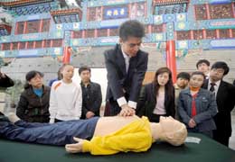 3月24日,北京急救醫療培訓中心急救導師陳志在做急救示范(左圖)。當日,來自北京地區的五十多家共100多名博物館工作人員參加了培訓。新華社記者:羅曉光