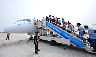 | 6月5日,旅客在天津濱海國際機場登上準備飛往大連的E190客機。據介紹,E190客機是先進的高性能噴氣式客機,可提供106個座位。新華社記者