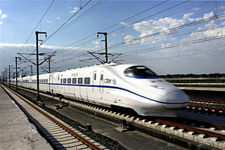 | 我國第一條時速350公里高速鐵路——京津城際鐵路試驗列車行駛在永樂站。原瑞倫