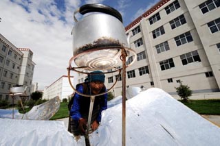 由于西藏高原離太陽最近、日照時間長,綠色能源——太陽能利用前景誘人。圖為一藏族老阿媽用太陽灶燒茶。本報記者:覺果 攝