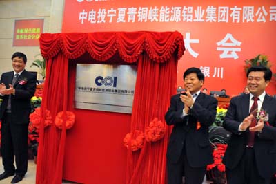 12月26日,注冊資本金50億元中電投寧夏青銅峽能源鋁業集團有限公司正式成立。寧夏政府主席王正偉(右一)與中國電力投資集團總經理陸啟洲(左一)等領導一起為中電投寧夏青銅峽能源鋁業集團有限公司揭牌。本報記者:武勇