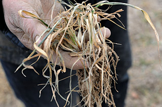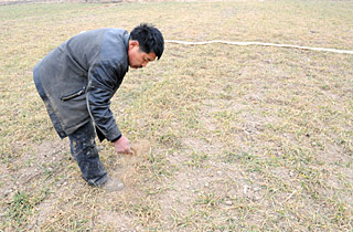 2月8日,連日陰霾之后,山東局部地區終于飄落一絲絲輕霧般的雨水。部分地區干渴的麥苗,仍見不到應有的綠意。 位于黃河下游南岸的高青縣青城鎮農民于振亭正在自家麥田里劃鋤保墑!叭ツ赀@個時候地里濕乎乎的,拔一把麥苗能帶出泥來。你看今年這苗兒,根上干巴巴的,不掛土!边@位農民告訴記者,目前在他所在的大于家村,個別地勢較高的地片已出現干葉死苗現象。眼看著立春已過,氣溫將不斷回升,大風天氣增多,要是再有半月不下雨,或者不澆地,就會出現大量死苗現象。